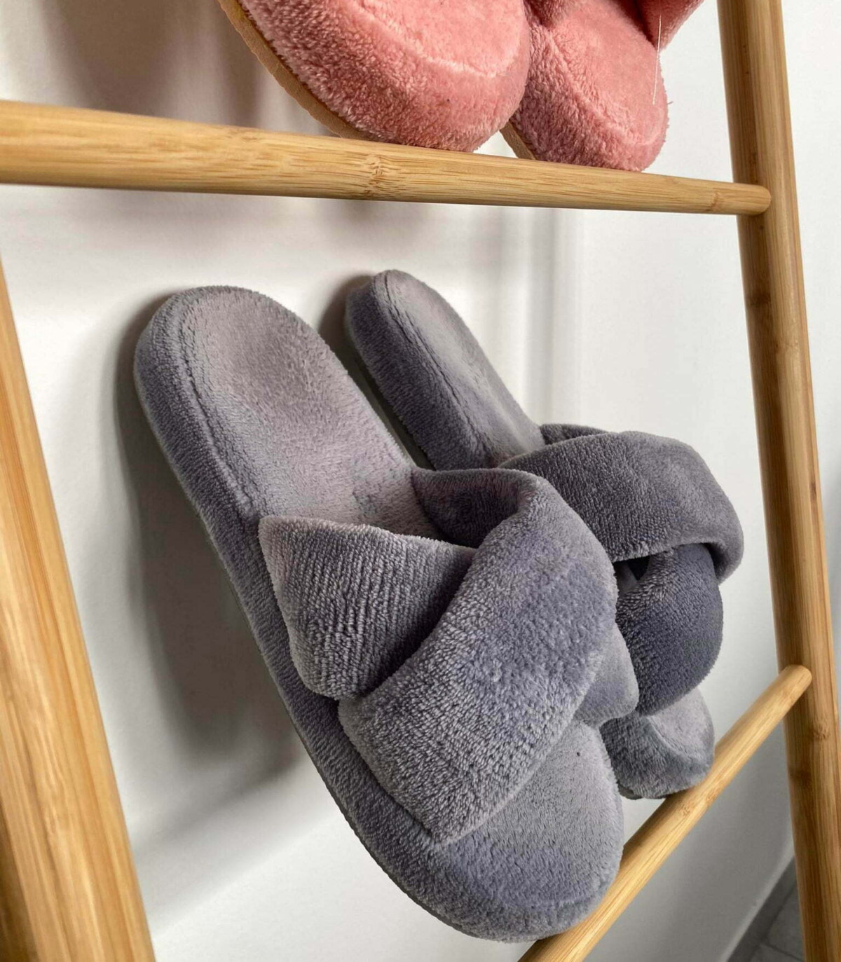 Χιαστί παντόφλες ύπνου με γούνινη επένδυση, ανοιχτές μπροστά.