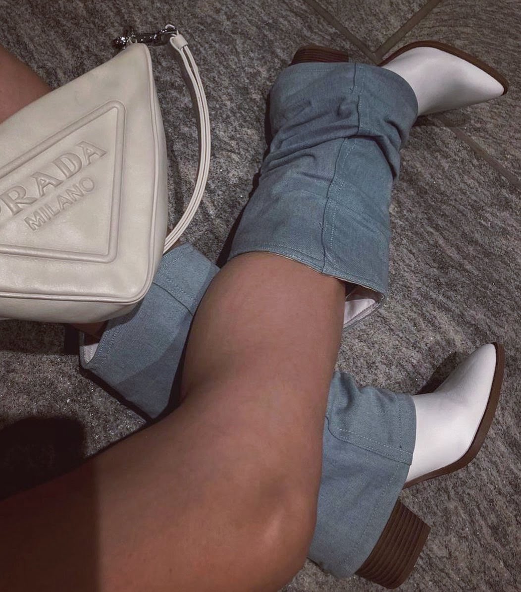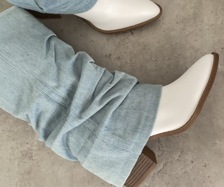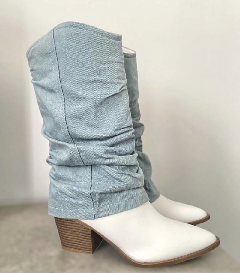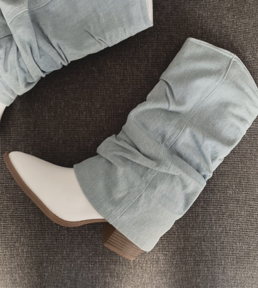 Μπότες σε λευκό χρώμα καλυμμένες με τζιν σε ανοιχτό χρώμα με μεσαίου ύψους τακούνι.
